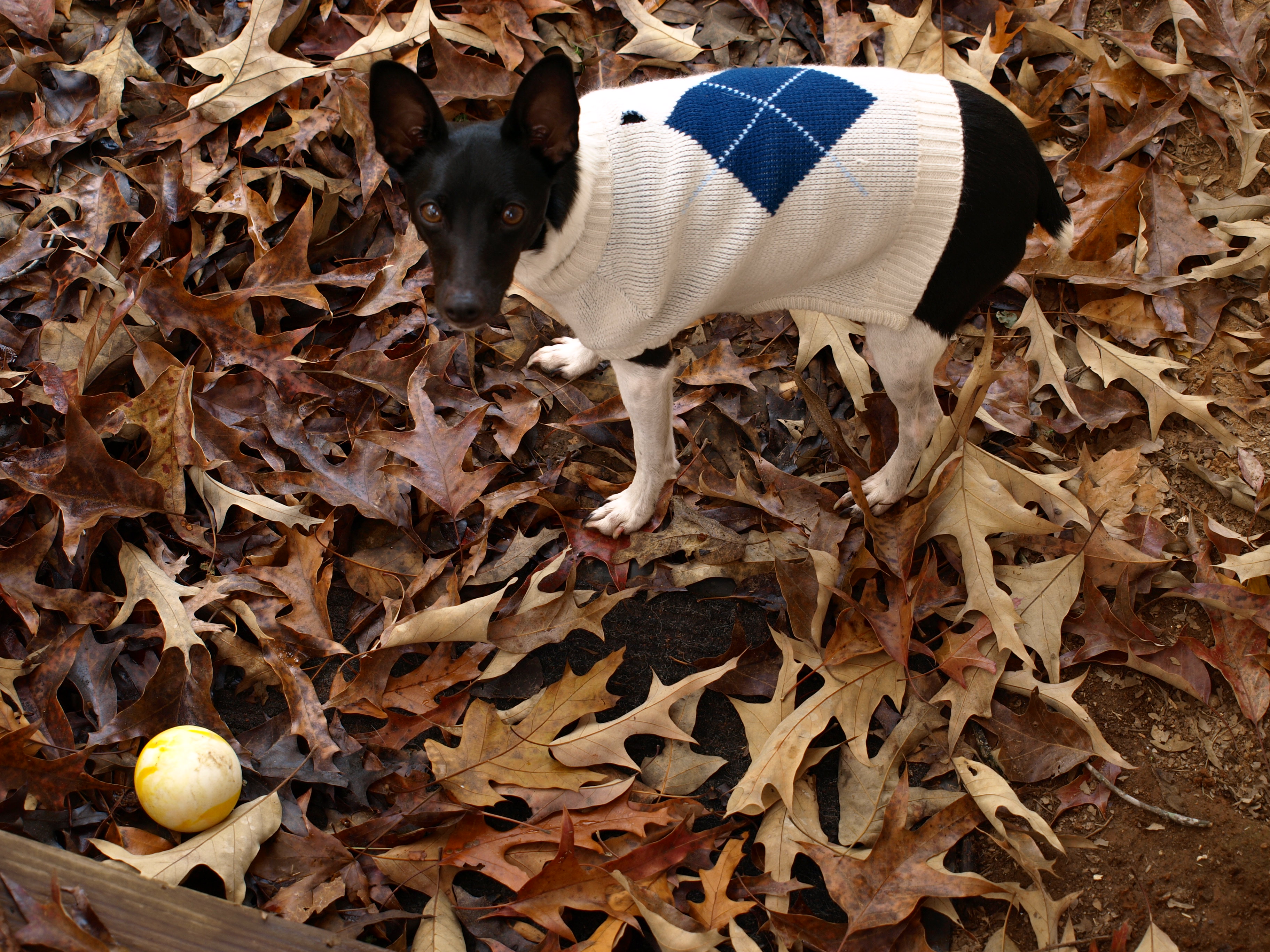 Oh yes, and as promised here is the little guy in his best sweater, giving me his best melt your heart, play with me look…