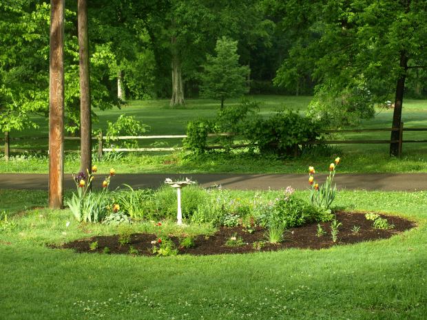 This morning I awoke to fog and when it burned off what was left was blue skies and sunshine! Here is a view looking out my picture window at my herb and flower bed, and as you can see, I am almost done getting this winter’s grass and spring’s weeds out of it.