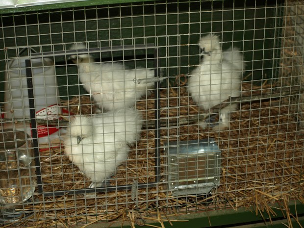 Here are the Silkies. They are living in the Chickie Hilton where I keep them safe from being plucked naked! Seems that the other Hennies are too attracted to all that lovely silky soft stuff and want it for their own! I am in the process of designing a chicken tractor for them. Poor things, they want to be out on their own to hunt and peck!