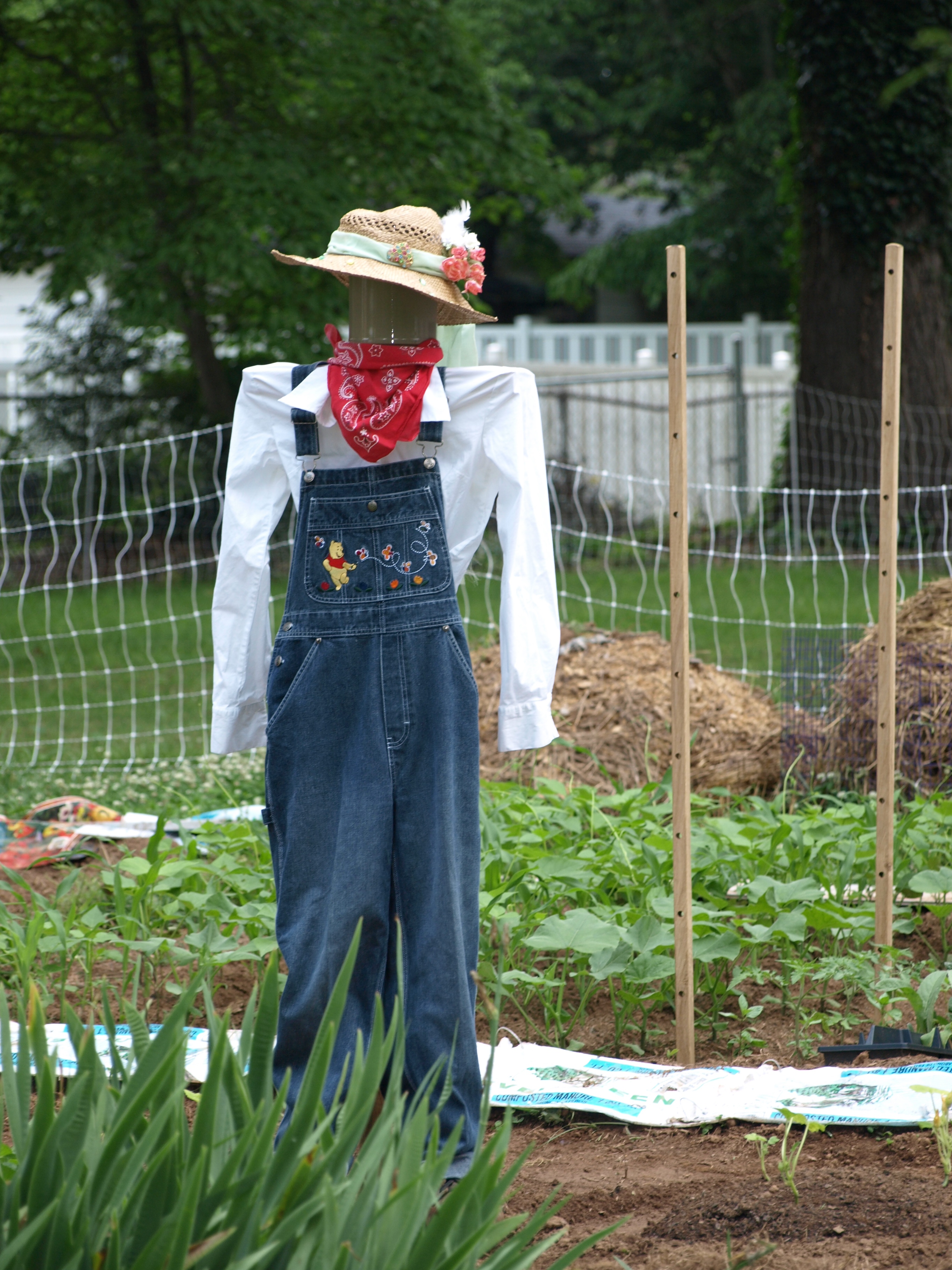 While they worked the soil, I did something I’ve wanted to do for a very long time. I built a scare crow! I started with an old blouse, well OK not so old, but definitely not worn anymore (teacher wear). I then added a pair of Disney overalls and a wretched looking straw hat I had procured from the thrift store (spent a whole $5.25). But the finishing touch was the boots that Bob is wearing in the photo above. He had to retire them at the end of the day because the toe in the left shoe had a blowout. Guess he got his money’s worth out of those Redwings… they were over 20 years old!
