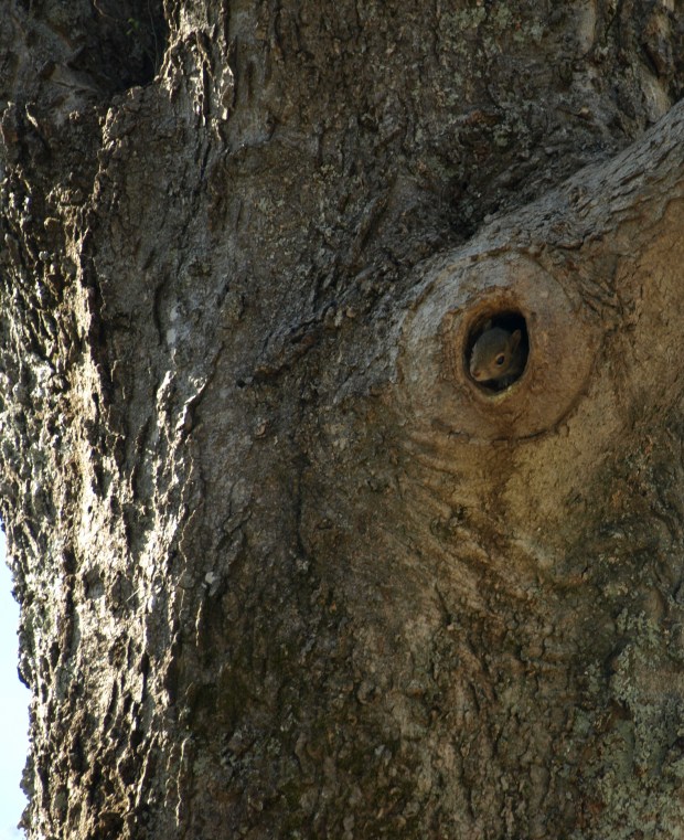 Fifteen feet off the ground this squirrel lives in the hollow hole of this tree, which is located in the fountain garden to the south side of the mansion.