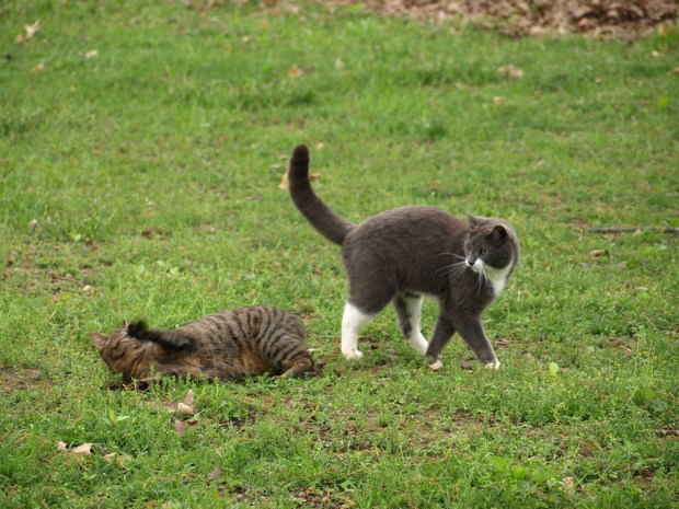 Yesterday out in the park, as we like to call it, I had the company of my two kitties Claus and Little Bit.  I love kitty watching as much as I do chicken watching!  Here is what I observed…