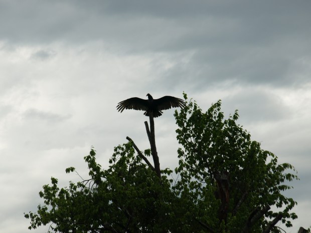 I am a Turkey Vulture, and this Friday past when the Lady of the Farmlet spied me atop the neighbors big tree she stopped everything she was doing and took pictures of me.  I am so flattered!  Though I must say she didn’t get my best side, and her photos are all grainy and out of focus to boot!  Well, let’s just imagine it was because she was in awe of my tremendous size and impressive stature.