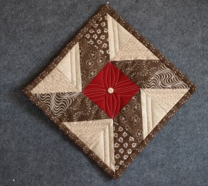 The Valentine’s centerpiece, supplied by my husband (Thank you Sweety 🙂 ) is sitting on my (almost) completed table runner.  The blocks go by Jacob’s Ladder, or the Underground RR.  This is one of the UFO’s.  I cut it out last March, but was too intimidated to actually begin the piecing process.  Two weeks ago, I decided to give it a go, and voila!  The picture of the completed project will be in focus I promise.  This project needs batting and a backing, but lacking a nice runner for Valentine’s dinner I put it on the table anyway.