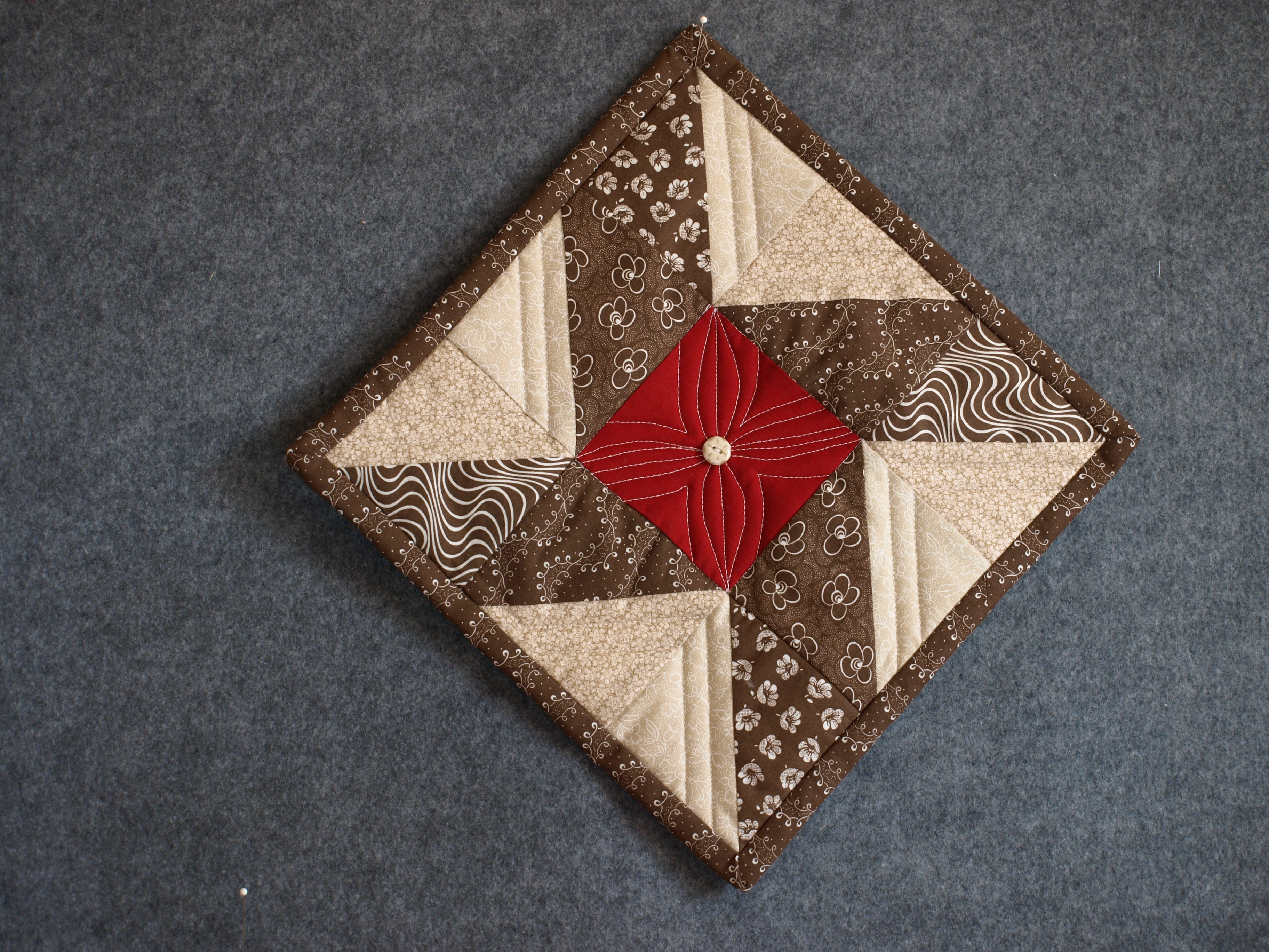 This is a smallish table rug 12 x 12 inches.  It was constructed as you would make a pot holder, and has a heat protective layer on the back.  I hope she likes it…