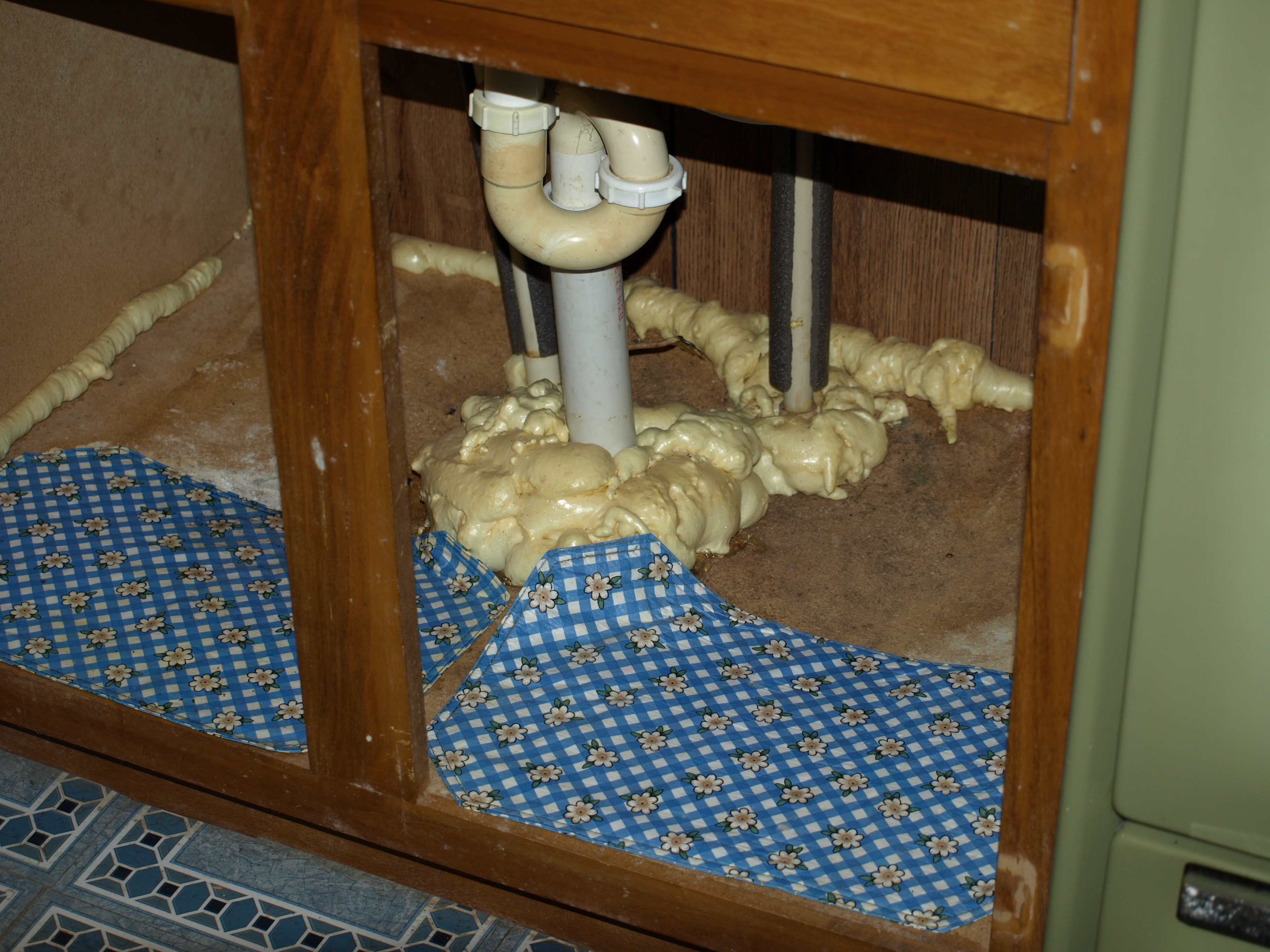 Now that I recognize. It looks like the lady may have had a county or state weatherization program do some work at one time or another. That stuff was a cheap way to keep out cold winter air and keep pipes from freezing. It was done just like that to one of my neighbor’s houses. Done by our city weatherization program instead of actually fixing the problem. For my neighbor the damage was caused by a leak around the sink drain that rotted the plywood cabinet bottom. Rats eventually found their way through the floor of my neighbors house because of the damaged area.