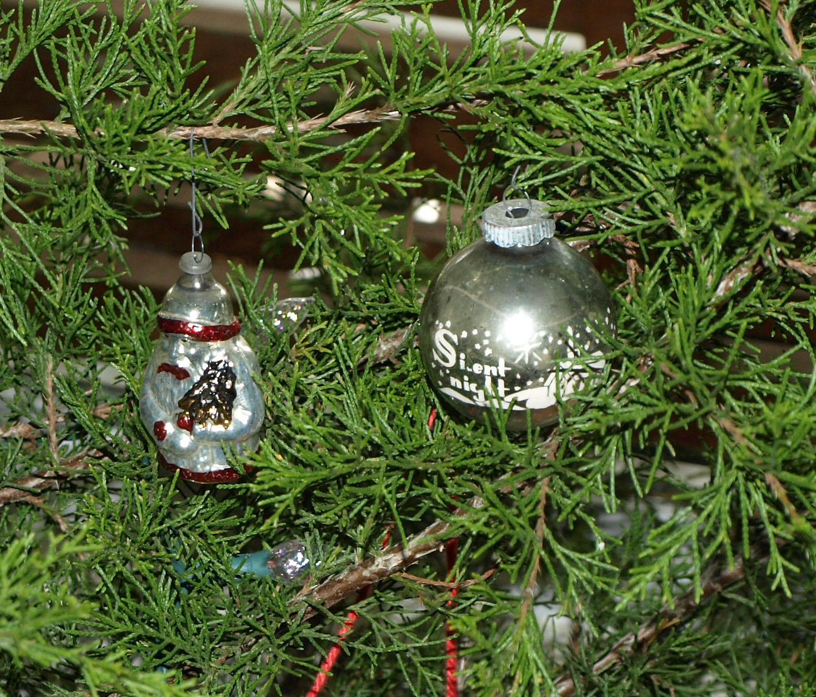 Carefully sliding between the wall and the Christmas tree I got myself into the corner. The space was just big enough for me, and sitting in my pine scented privacy I began to examine the collection of ornaments placed onto the back of the tree.