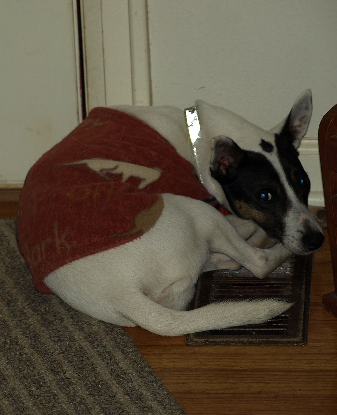 I use a fleece blanket for Dixie to lay on. She gets cold, too, despite her fur, and I read somewhere that fleece blankets both trap and radiate heat. So, I folded one up under the towl on the sofa, and that’s where she is now, mostly day and night. Of course, Noodles is younger, and probably not given to sleeping as much as Dixie does.