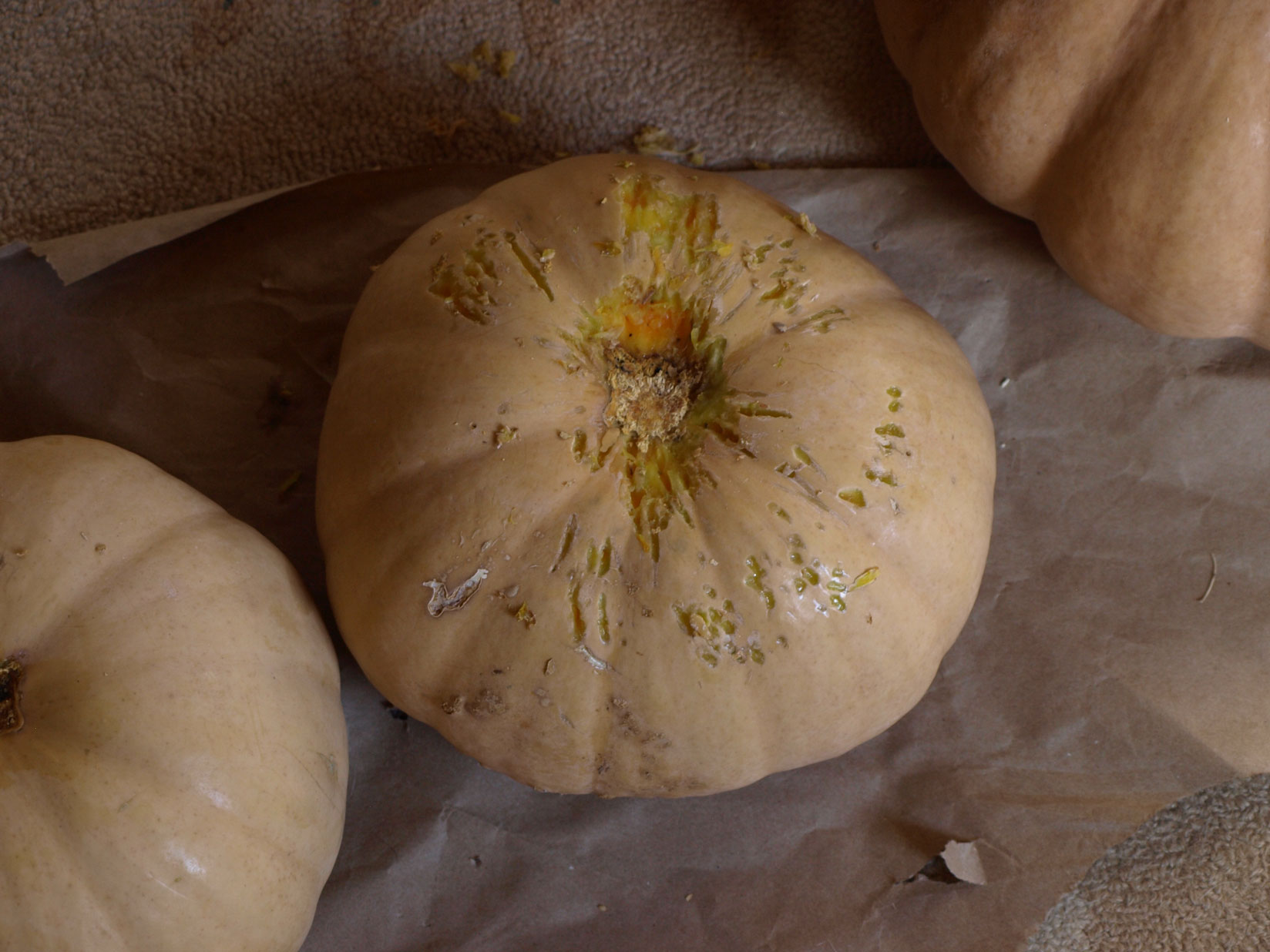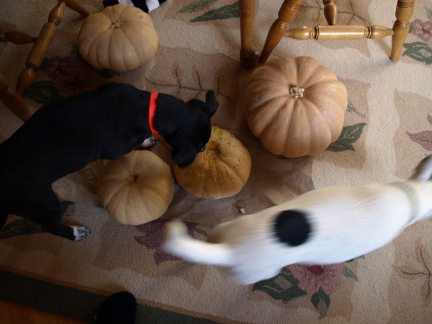 NOTES on chewed pumpkins: I recently read somewhere, that a bit of pumpkin is good for dogs. So I’m thinking of cooking it down, mashing it up and then mixing with a bit of brown rice to make frozen dog treats. (2 p to 1 r) If you know differently, please do tell!