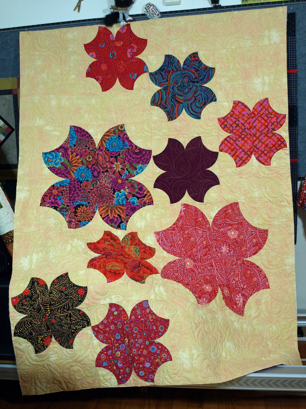 And on the brighter side, literally and figuratively, I have a near finish on my Posh Posies quilt. I got it back from the new quilter this week and it needs binding for a finish. Remember this?