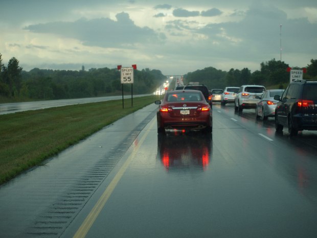 The rain and traffic looked like this. Do you see the final narrowing down to one lane up on the hill? HA! 55 MPH? No 5 MPH.