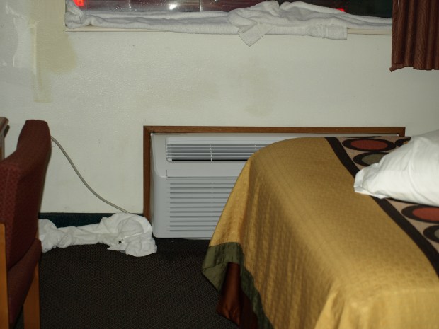 So I get ready for bed, and then I see it… it is raining sideways out there and it is coming in through the seams along the base and sides of the window! The management brought me plenty of towels to block and sop up the mess. YIKES!
