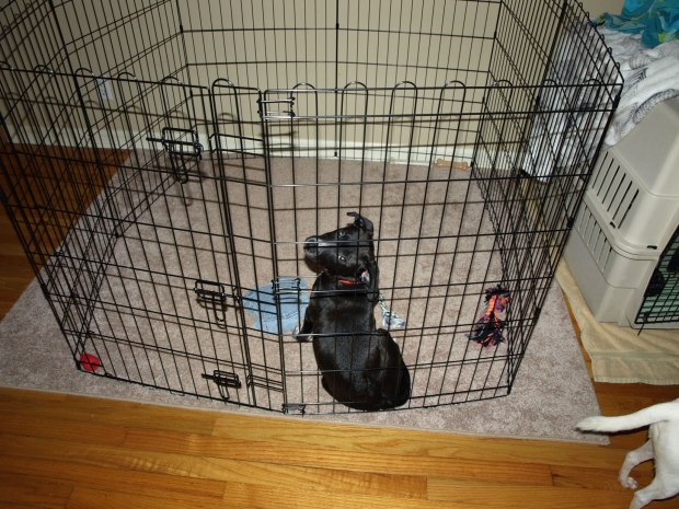 If I am busy about the house, then he is in his puppy prison playpen.
