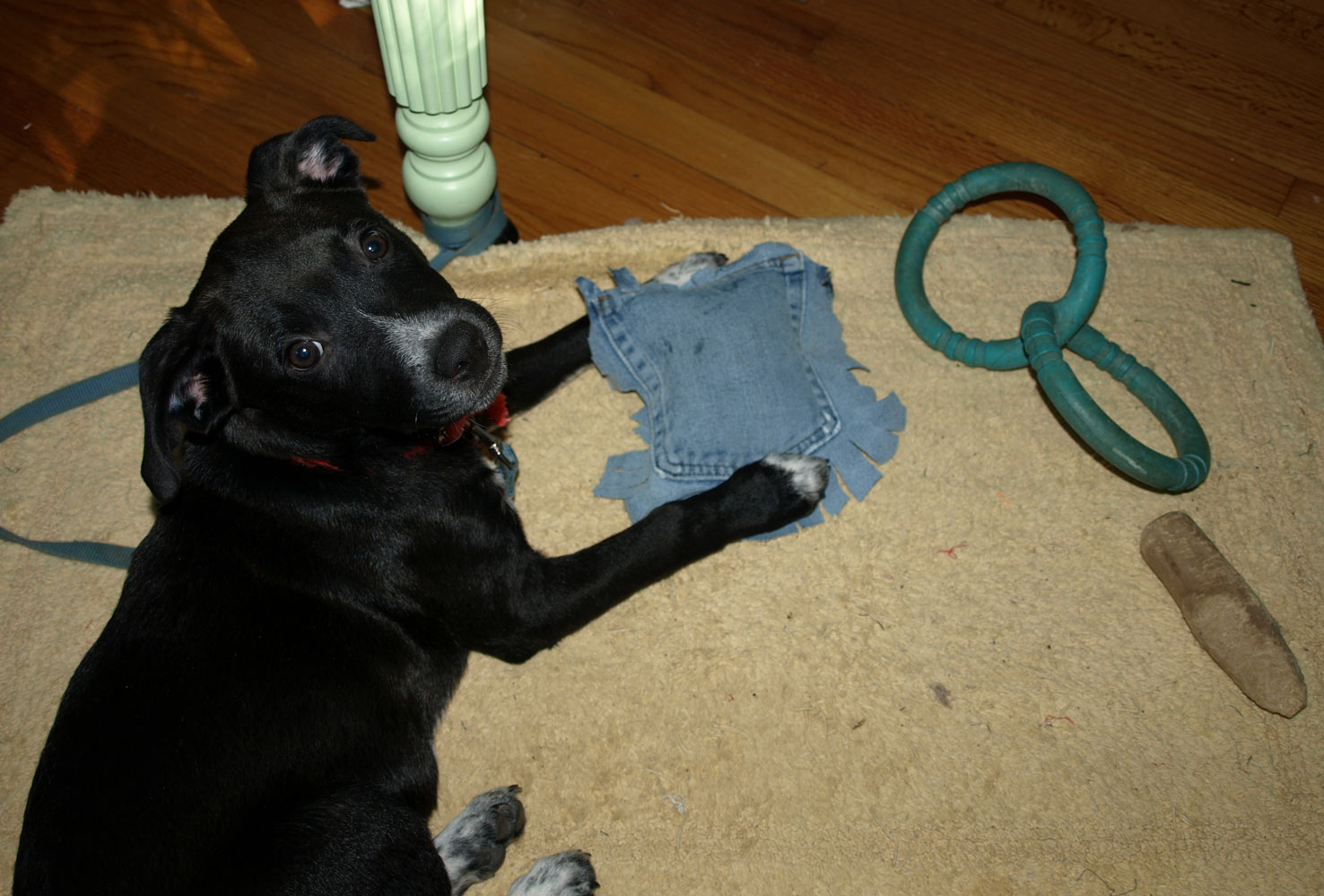 So today I took one of the many pockets I have saved from Bob’s old blue jeans and stuffed it with leftover quilting fluff and one of the squeaky buttons from the killed plush toys, then sewed it shut and voila! A new chewy for Walker.