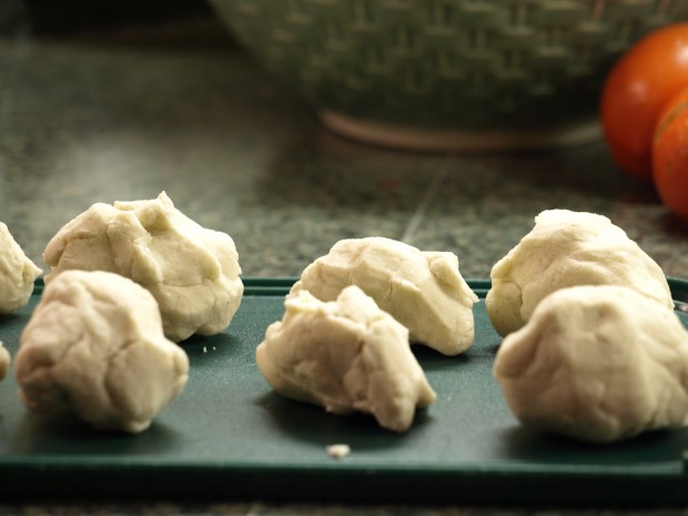 2)     Divide dough into equal portions of about the size of a small tangerine.  I find it easiest to just divide the dough into half, and continue