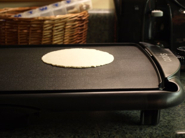 5)     Flip your hand over the pre-heated griddle or pan letting the tortilla land on the surface. Wait about 1 minute.