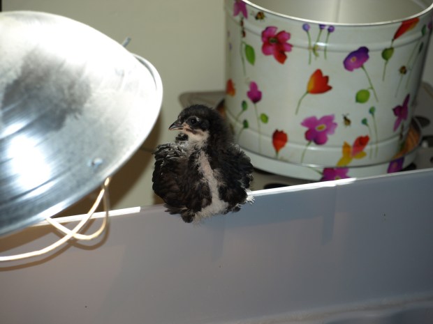 I thought to post a picture of the group, but decided on just two from the group. These two are such characters! The little black one is so feisty! Almost from the first week he has challenged me when I put my hand into the brooder, and as you see he was the first to make it out of the brooder under his own power! He used to sit up there and survey the world several times a day. When he jumped down and went ‘walk-about’ I knew it was time to take everybody to the outside hutch!