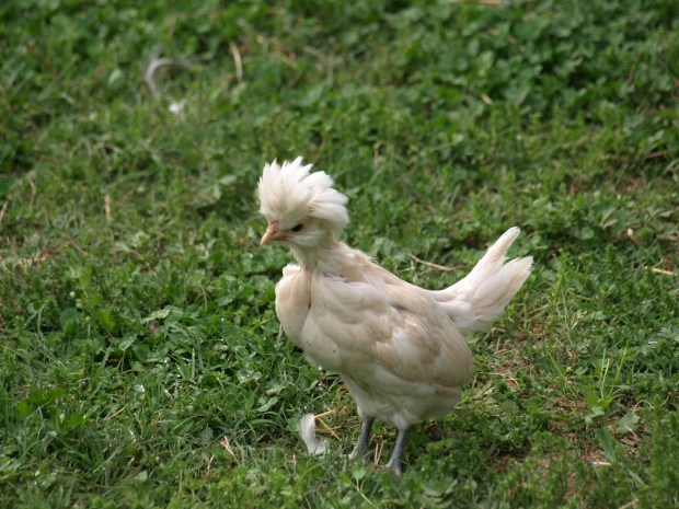 This little buff colored fellow is called a Buff Polish. He is the the epitome of independence, and has no fear as he struts about the world of chickendom… like he owns all he surveys! He looks a bit silly now, but wait till he is full-grown. His color will darken and he is going to be a beauty!