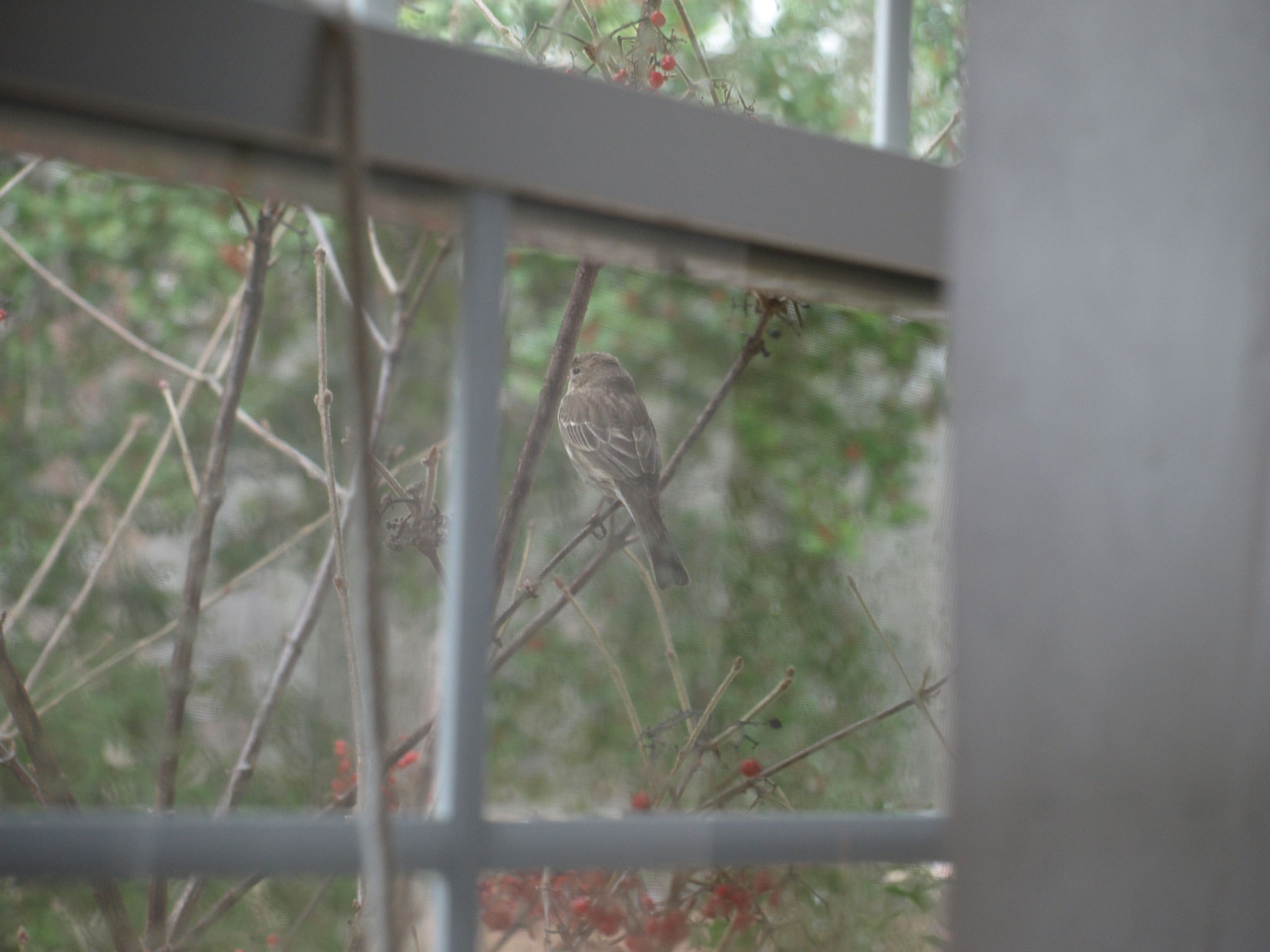 A gust of wind smashes the large bush that grows in front of my window and I suddenly notice the birds that have taken refuge in its branches. Hanging on tightly they are blown this way and that, yet seem unconcerned by the wild ride. Instead, between gusts, they manage to move from branch to branch to consume the red berries there.