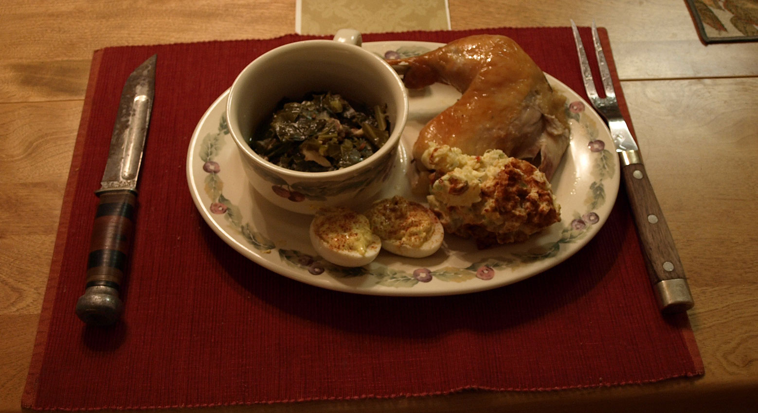 Bob was so excited about dinner that he wanted All Y’all to see we had a good southern summer picnic affair complete with roast chicken, tater salad, collard greens, deviled eggs, and apple pie a la mode! What else you gonna cook in weather like this?