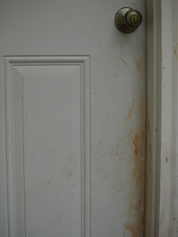 People who live in areas with red clay soil, and own kitties who “knock” at the door, should NOT have white doors on their house.