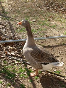 Now, because she is done, and ready to go join her friends, I open the kennel fence and we walk back to the side of the yard where the rest of the geese are eating and swimming. They honk greetings all around and then continue their grazing.