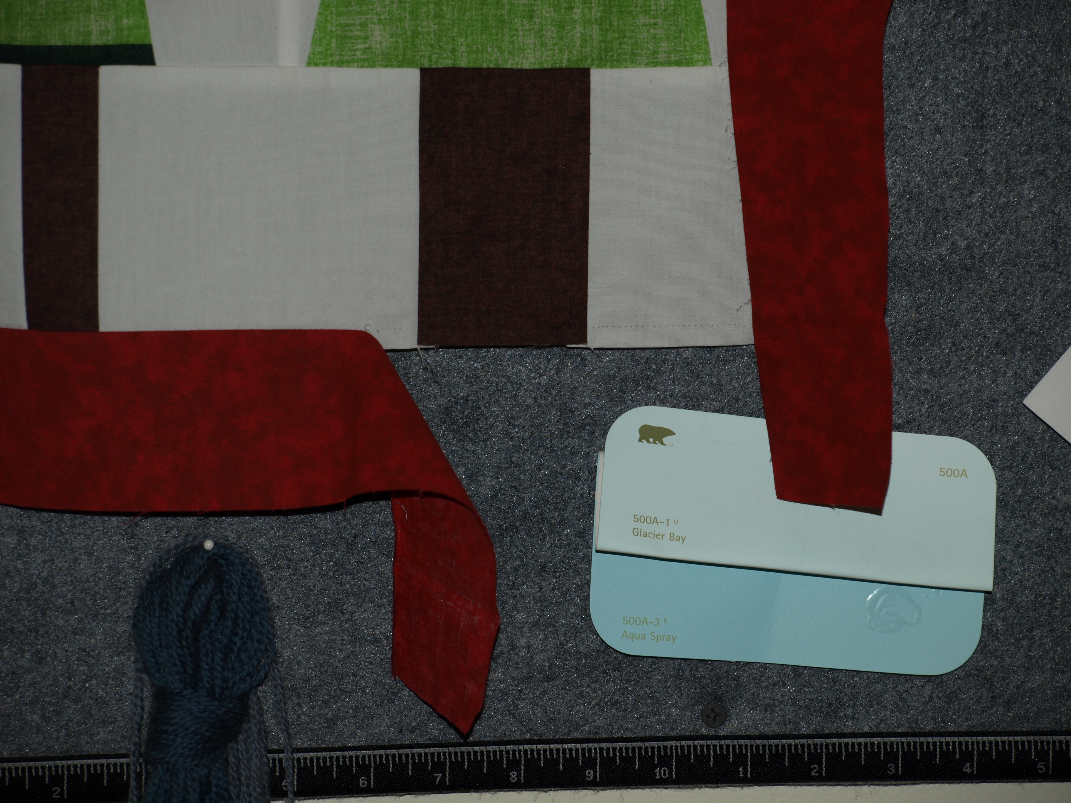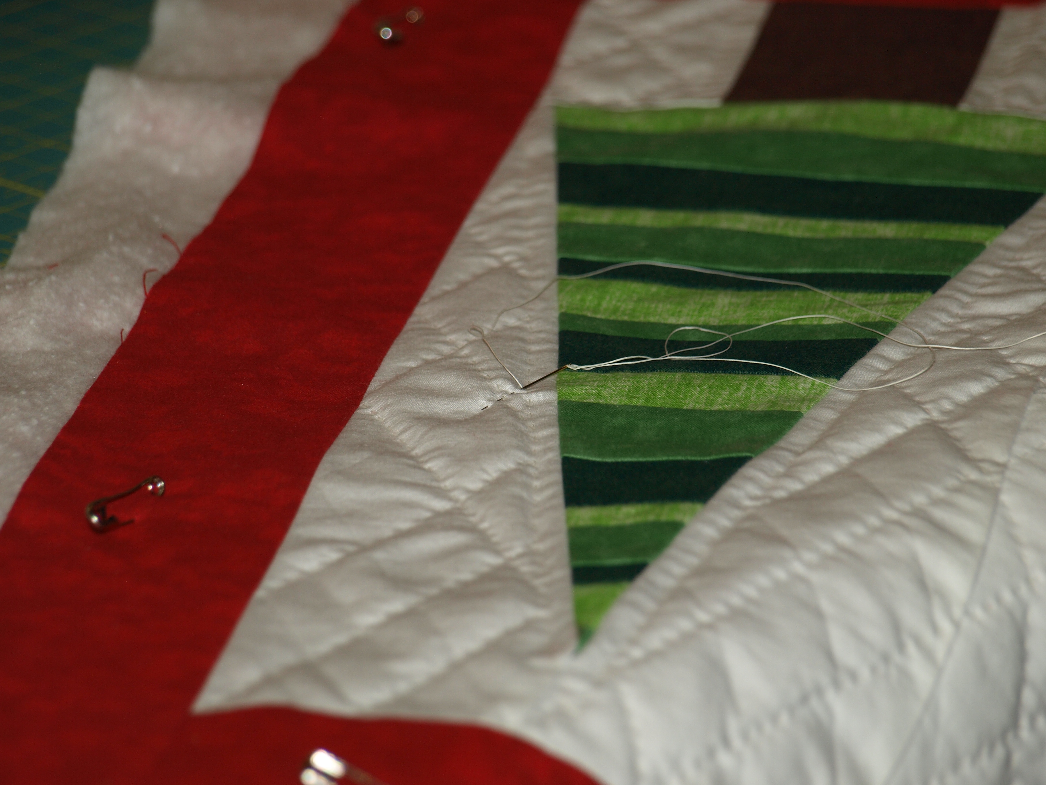 I also liked my stripped fabric, and that is not a typo! I made the green stripes by sewing together varying green colored strips. However, this also added thickness and made it harder quilt too!