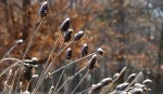 This morning I woke up to COLD air, and frozen steps.  It rained last night and then the temperature dropped.  The leftover leaves from fall made their own heat and did not freeze.  In making my rounds I found that gate latches stuck and hinges cracked on opening.  Strange to see, that the metal fence rails and the arching rose canes all had what appeared to be raindrops hanging on them.  A quick touch revealed that they were frozen in place!  Perfect little droplets suspended like strings of diamonds.